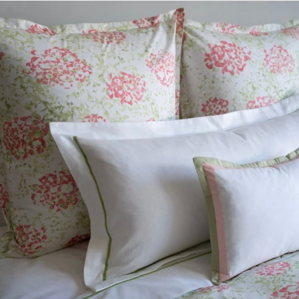 Bed Skirts are standard as gathered skirts, 18" long with a deck and unlined. They are available as panels with pins instead of a deck, tailored with center pleat, and/or lined and in custom lengths. Please contact the shop to discuss customizations.